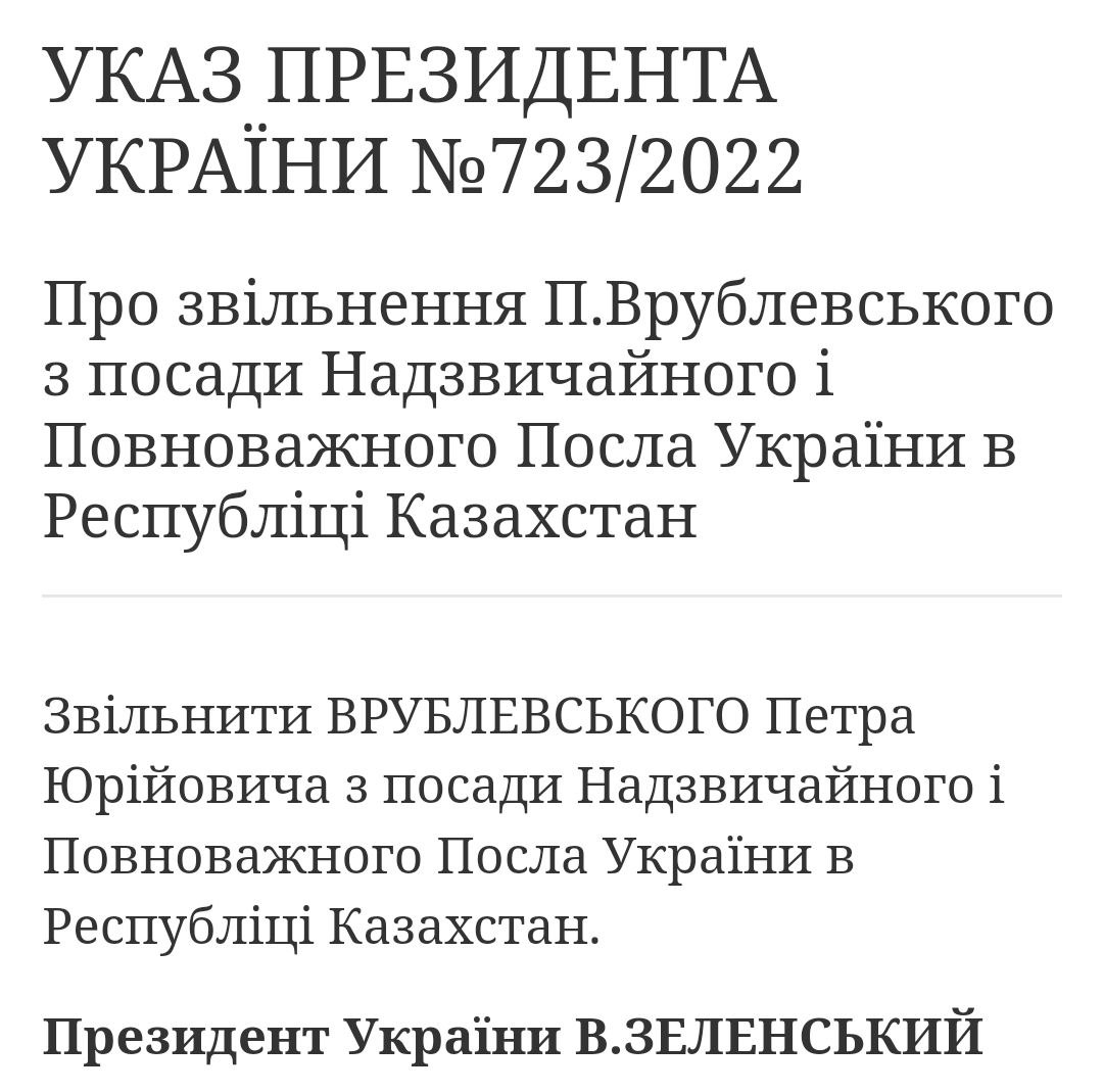 07.25 Владимир Зеленский уволил посла Украины в Казахстане Петра Врублевского, который призывал "убить как можно больше русских".