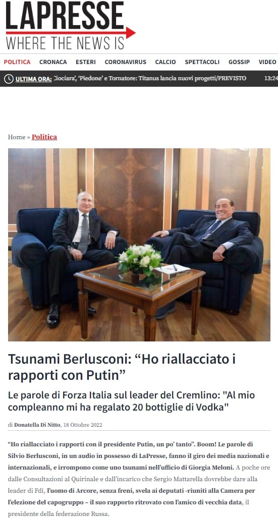 "Путин прислал мне 20 бутылок водки и очень милое письмо на день рождения. Я ответил ему бутылками ламбруско и таким же милым письмом. Я знал его как человека мирного и благоразумного. Российские министры уже несколько раз говорили, что мы с ними воюем, потому что поставляем оружие и финансируем Украину. Лично я не могу высказать свое мнение, потому что, если оно будет сообщено прессе, это обернется катастрофой, но я очень волнуюсь. Я немного восстановил отношения с президентом Путиным", - заявил Берлускони.
