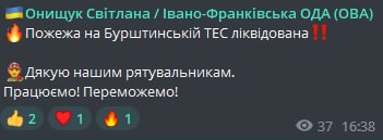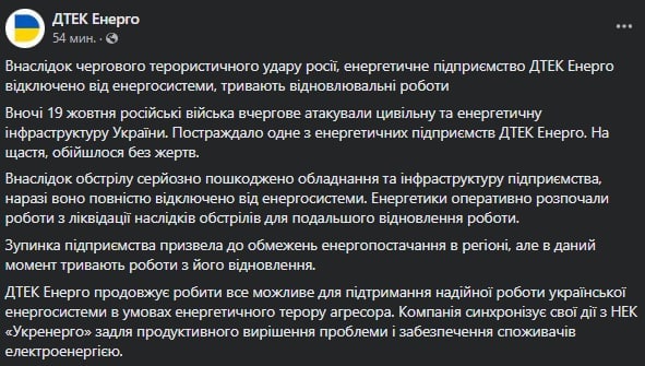 "Ночью 19 октября российские войска в очередной раз атаковали гражданскую и энергетическую инфраструктуру Украины. Пострадало одно из энергетических предприятий "ДТЭК Энерго". К счастью, обошлось без жертв", - говорится в сообщении.