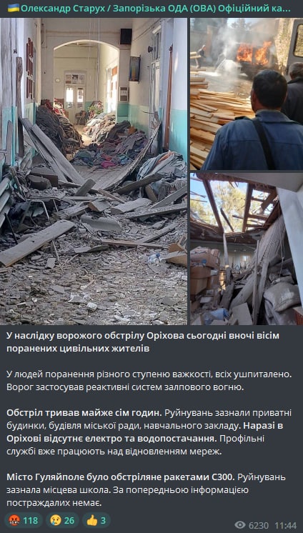 11.58 В результате обстрела Орехова восемь раненых гражданских, сообщил глава Запорожской ОГА Александр Старух.