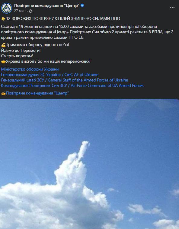 Враг использовал крылатые, авиационные и зенитные управляемые ракеты. Кроме того, 14 беспилотников иранского производства "Shahed -136", 10 из которых были сбиты.