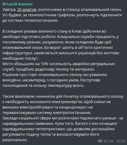 Об этом сообщил мэр города Виталий Кличко в своем тг-канале.