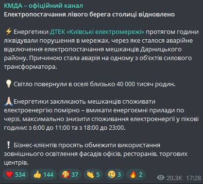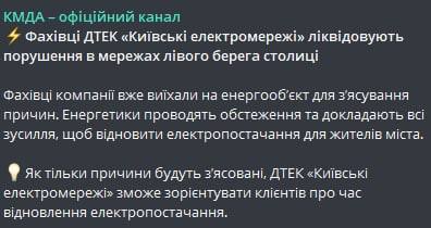 Об этом сообщил "ДТЭК Киевские региональные электросети" в Фейсбуке.
