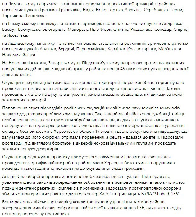 2. За сутки противник нанес 10 ракетных и 18 авиационных ударов, совершил более 76 обстрелов из реактивных систем залпового огня. Ударам подверглись Киев, Житомир, Харьков, Днепр, Кривой Рог, Запорожье, Курахово, Николаев.