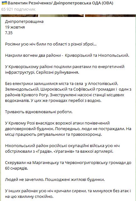 07.55 Ночью в Днепропетровской области от обстрелов РФ пострадали Криворожский и Никопольский районы.