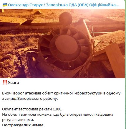 08.20 В Запорожской области ночью по одному из сел РФ ударила ракетами С 300. Повреждена критическая инфраструктура. Возник пожар. Пострадавших нет.