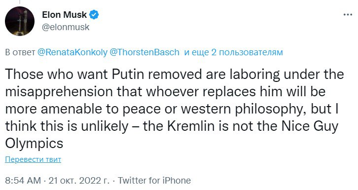 "Те, кто хочет убрать Путина, ошибочно полагают, что тот, кто его заменит, будет более склонен к миру или западной философии, но я думаю, что это маловероятно - Кремль не Олимпиада Славных Парней", – написал он в Твиттере.