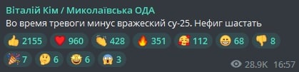 Во время воздушной тревоги над Николаевской областью сбили Су-25 противника. Об этом 21 октября сообщил глава Николаевской ОВА Виталий Ким в своем телеграм-канале.