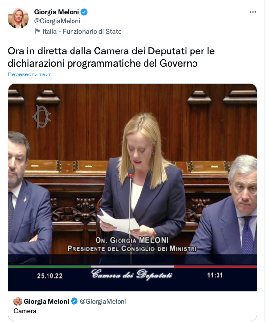 "Я благодарна многочисленным иностранным лидерам, которые пожелали мне успеха в должности премьера. Я заметила, что их интересует то, как Италия будет позиционировать себя в ЕС, в его структурах. Эти структуры – именно то место, где мы будем добиваться того, чтобы наш голос был услышан", – сказала Мелони.