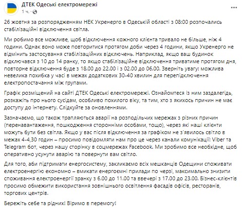 Отключения с того же времени начались и в Одесской области. Обещают держать без света не более четырех часов. При этом график может быть нарушен, если будет аварийная ситуация.