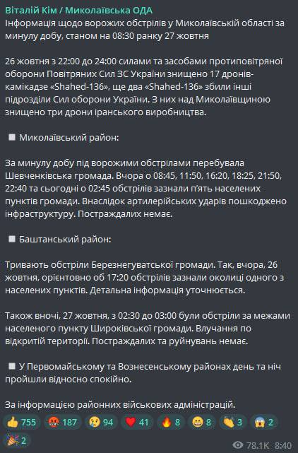 Глава Николаевской ОВА Виталий Ким добавил, что вчера за два часа - с 10 вечера до полуночи, силы ПВО сбили 17 дронов-камикадзе. Из них три - над Николаевской областью.
