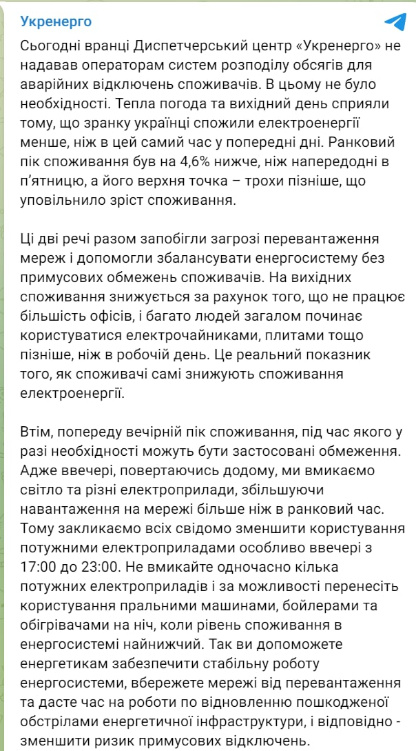 Об этом пишет "Укрэнерго" на своих официальных ресурсах, но предупреждает, что вечером ограничения могут быть применены "в случае необходимости".