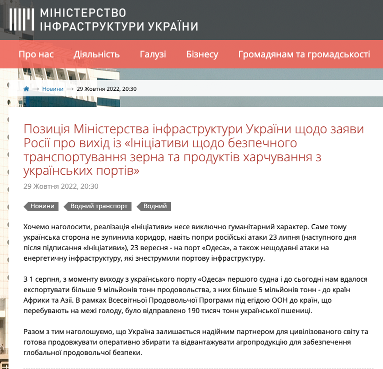 В то же время Министерство инфраструктуры Украины заявляет, что готово и дальше поставлять зерно на мировой рынок.