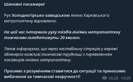 Движение всех трех линий харьковского метро возобновлено. В частности, возобновлено движение Алексеевской, Салтовской и Холодногорско-заводской линиями метрополитена.