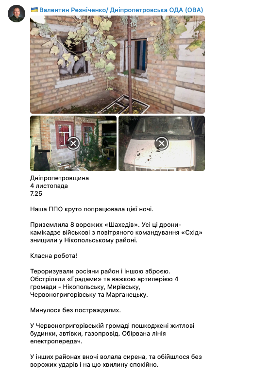 Утром губернатор Днепропетровской области Валентин Резниченко сообщил, что в Никопольском районе этой ночью сбили восемь дронов-камикадзе "Шахид". Также район обстреляли "Градами" и тяжелой артиллерией, обошлось без пострадавших.
