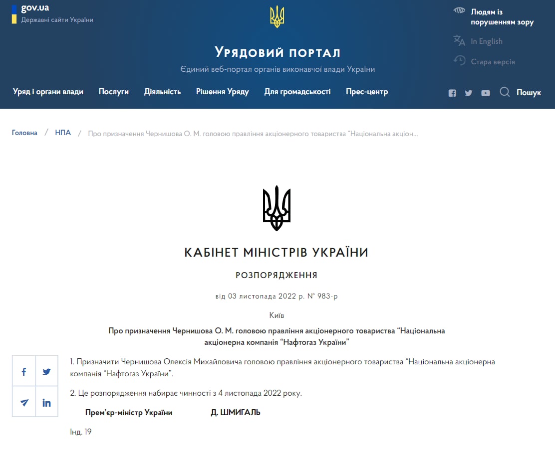 На сайте Кабмина появилось распоряжении о назначении Алексея Чернышова главой "Нафтогаза".