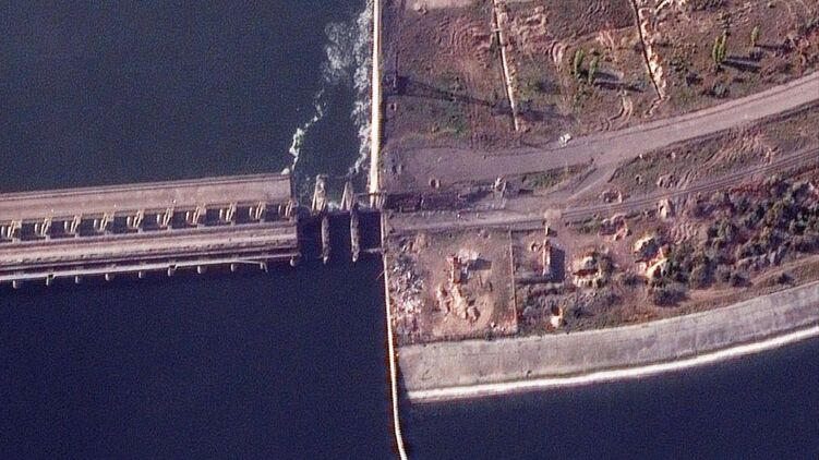 Ворота под разрушенными секциями моста - единственные, через которые сбрасывается вода, но по спутниковым снимкам неясно, были ли они повреждены в результате взрыва и контролируется ли сброс воды или затрудняется обрушившимися секциями моста.
