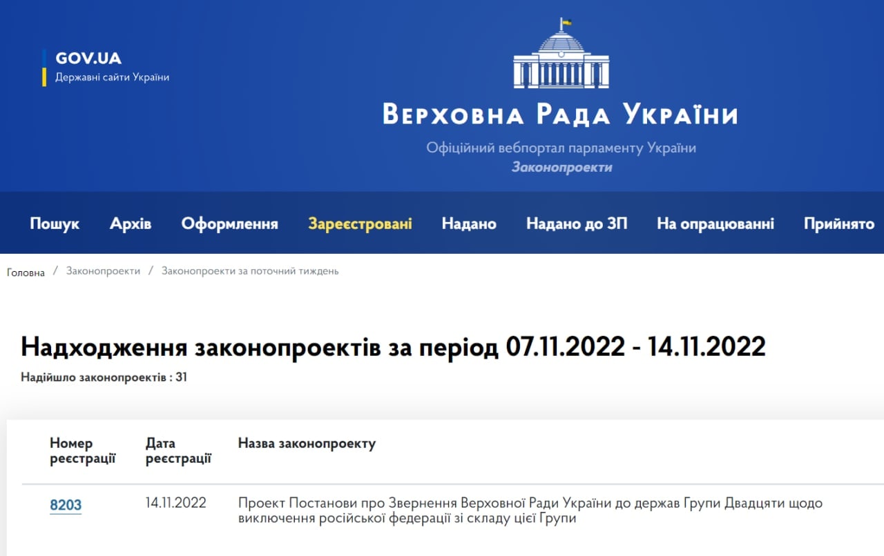 10.04 Депутаты Верховной Рады хотят обратиться к G20 с просьбой исключить РФ из состава группы.