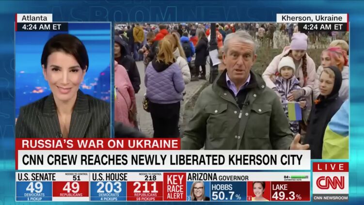 Корреспондент CNN выходил в прямой эфир с центральной площади Херсона, где собрались местные жители, празднующие отступление российских войск.