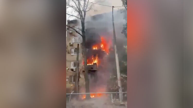Также в сети появилось видео горящего дома в Киеве, на который упали обломки российской ракеты.