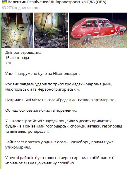 В Днепропетровской области ночью 16 ноября россияне нанесли удары по трем громадам - Марганецкой, Никопольской и Красногригорьевской.