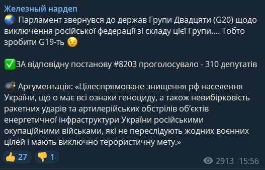 Верховная Рада поддержала обращение к G20 с призывом исключить из ее состава Россию и стать G19.