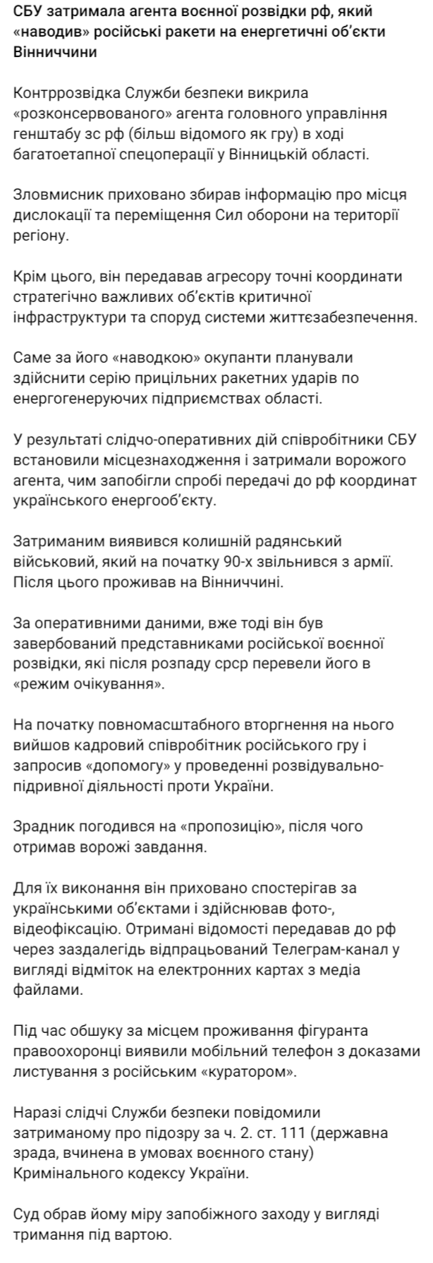 СБУ задержала бывшего советского военного, который "наводил" российские ракеты на энергетические объекты Винницкой области. Он уволился из армии в начале 90-х и после этого жил в Винницкой области.