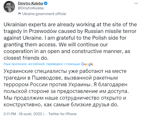 "Украинские специалисты уже работают на месте трагедии в Пшеводуве, вызванной ракетным террором России против Украины. Я благодарен польской стороне за предоставление им доступа. Мы продолжим наше сотрудничество открыто и конструктивно, как это делают ближайшие друзья", - отметил Кулеба.