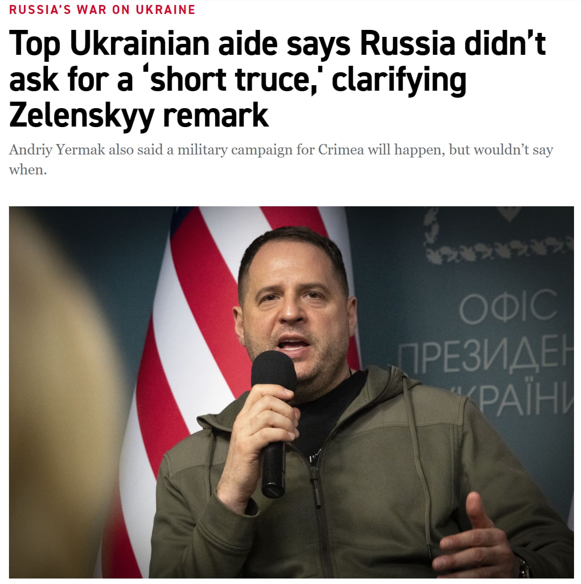 "Андрей Ермак, возглавляющий офис президента Украины, заявил, что Кремль не предлагал украинскому правительству такую ​​паузу", - пишет Politico.