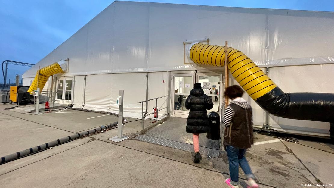 Первичный центр приема мигрантов оборудован в здании бывшего аэропорта. Все 1600 мест, отведенных для украинцев, уже заняты, поэтому приходится размещать людей в больших палатках. Два временных жилых помещения - на 400 человек каждое - стоят на бывшей взлетно-посадочной полосе. Теплый воздух нагоняется внутрь через шланги с помощью генераторов.
