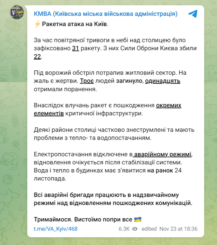 Между тем, в Киевской городской военной администрации заявляют, что вода и тепло должны вернуться в дома киевлян к завтрашнему утру. Возобновление электроснабжения ожидается после стабилизации системы.