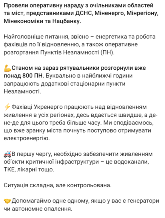 "Специалисты Укрэнерго работают над восстановлением питания во всех регионах, где-то удается быстрее, а кое-где для этого нужно больше времени. Мы надеемся, что уже с утра города начнут постепенно получать электроэнергию", - заявил замглавы ОП Кирилл Тимошенко.