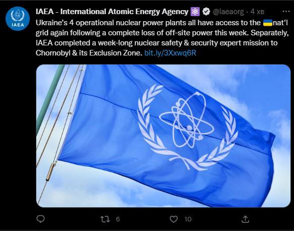 "Все 4 действующие атомные электростанции Украины снова получили доступ к украинской национальной сети после полной потери электроэнергии за пределами площадки на этой неделе. Отдельно МАГАТЭ завершило недельную миссию экспертов по ядерной безопасности и физической безопасности в Чернобыль и его зону отчуждения", - говорится в сообщении.
