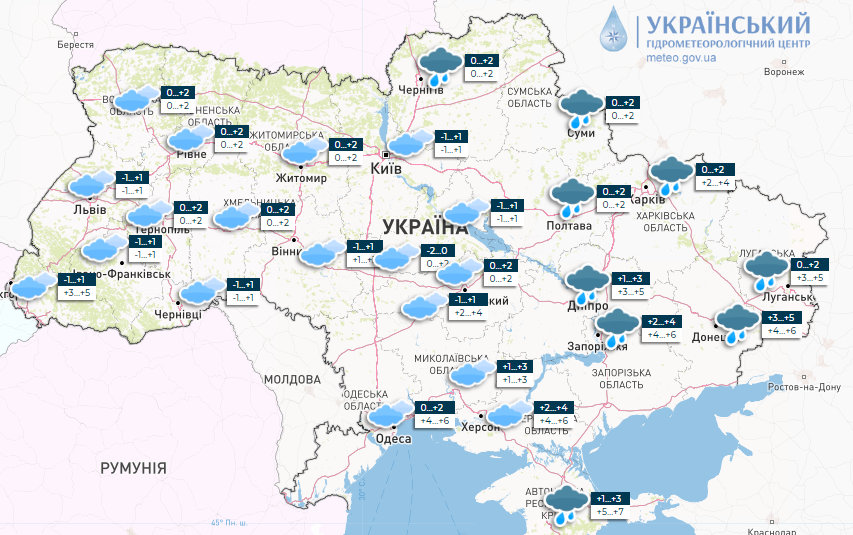 По данным Укргидрометцентра, в субботу, 26 ноября, средняя температура воздуха ночью по стране составит -1°…+1°, днем -1°…+1°, ветер северо-западный до 5-10 м/с, облачно и дождь с мокрым снегом в течение дня.