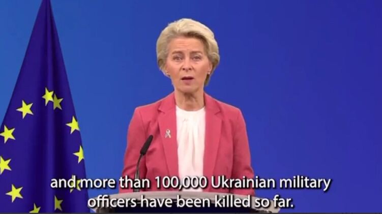 Напомним, из видеообращения главы Еврокомиссии вырезали заявление о гибели 100 тысяч украинских военных. Спикер президента Сергей Никифоров заявил, что информация о потерях является "чувствительной", поэтому озвучивать ее может главнокомандующий, министр обороны и президент. Украина данных о своих потерях не публикует.