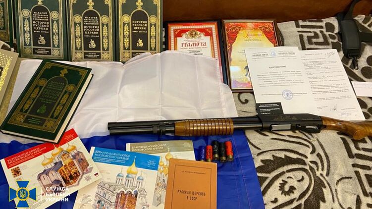 "На чердаке этого же объекта сотрудники СБУ обнаружили маскировочную сетку, обычно используемую в военных целях: для маскировки вооружения, техники и инженерных сооружений. В помещениях Херсонской епархии было найдено ружье без соответствующих разрешительных документов, флаг и золотой герб России. Спецслужба также взяла на проработку информацию о нескольких священнослужителях, которые, вероятно, контактируют с гражданами РФ и РБ. Кроме того, правоохранители обнаружили пропагандистские материалы, где прославляется Россия", – сообщила СБУ.