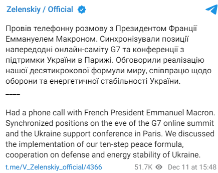 "Синхронизировали позиции накануне онлайн-саммита G7 и конференции по поддержке Украины в Париже. Обсудили реализацию нашей десятишаговой формулы мира, сотрудничество в обороне и энергетической стабильности Украины", - написал глава украинского государства.