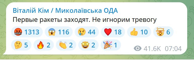 08:10 Губернатор Николаевской области Ким заявили о заходе ракет на территорию Украины, где объявлена тревога в ряде областей.