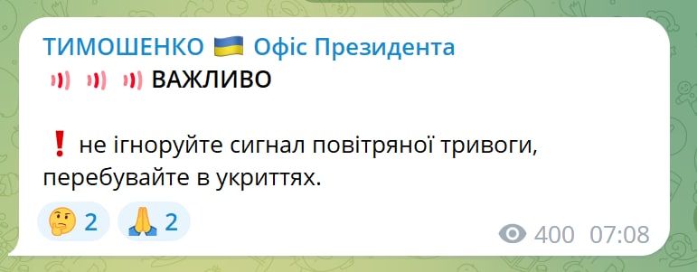 08:52 Власти Житомирской области предупредили, что может быть еще и налет беспилотников-камикадзе.
