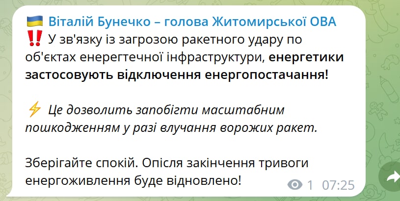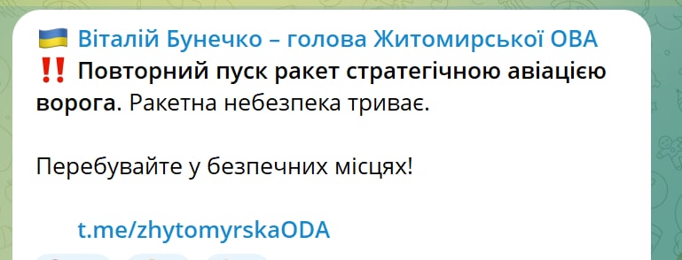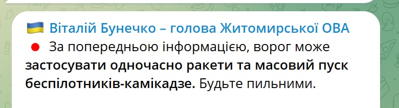 08:17 Губернатор Житомирской области Бунечко пишет об угрозе массированного ракетного удара.