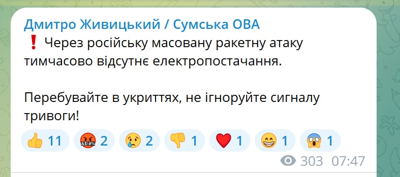 08:49 Сумские власти заявляли об отключении электроснабжения из-за массированной российской ракетной атаки.