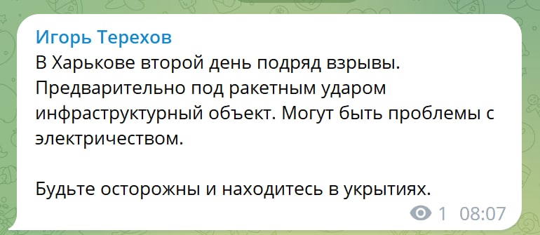 09:07 Мэр Харькова говорит о прилете в инфраструктурный объект и предупреждает о перебоях со светом.