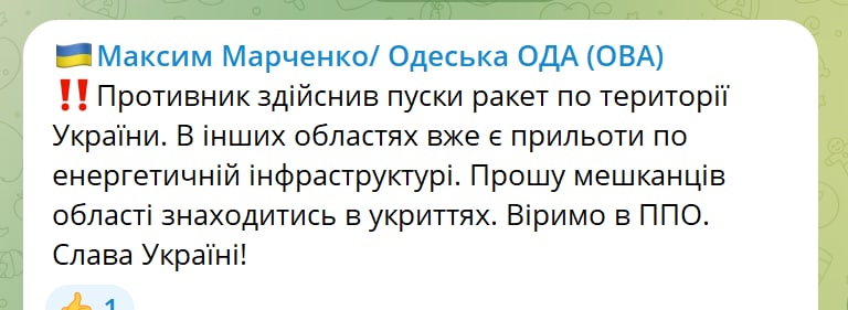 09:09 В ряде областей есть прилеты по объектам энергетической инфраструктуры. Об этом заявил одесский губернатор Марченко.