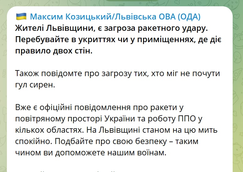09:26 Об угрозе ракетного удара предупредили власти Львовской области.
