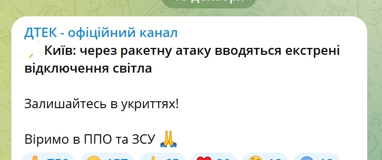 09:50 В Кременчуге нет ни света, ни тепла. Мэр города Малецкий призвал всех закрыть окна, чтобы не охлаждать квартиры.