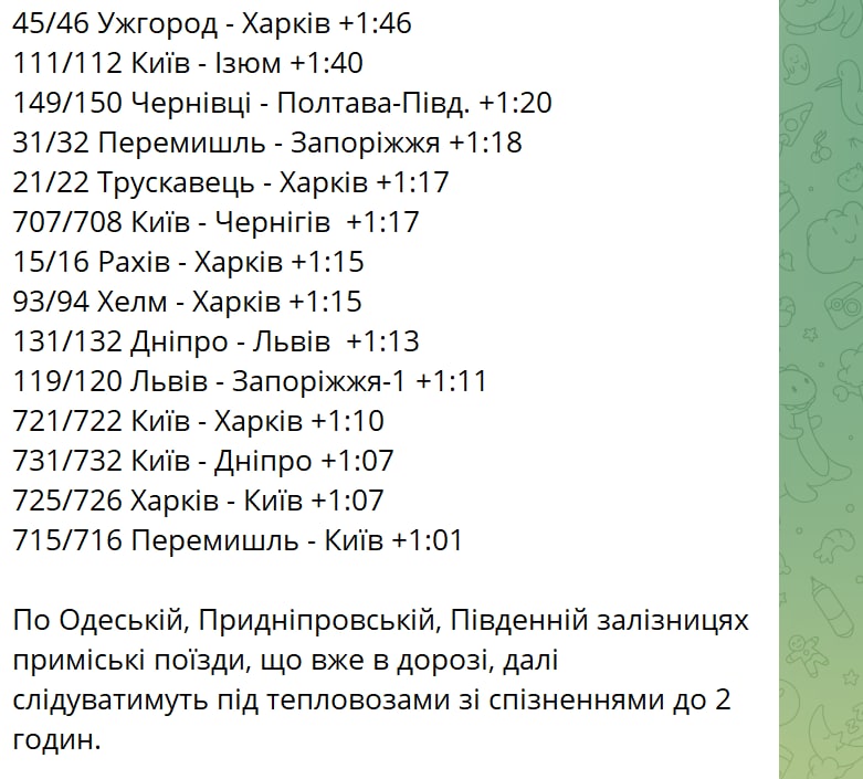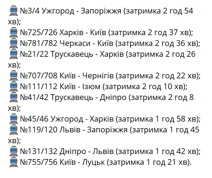 21:03 Поезд Киев – Краматорск из-за последствий обесточивания опаздывает уже на 9 часов 24 минуты.