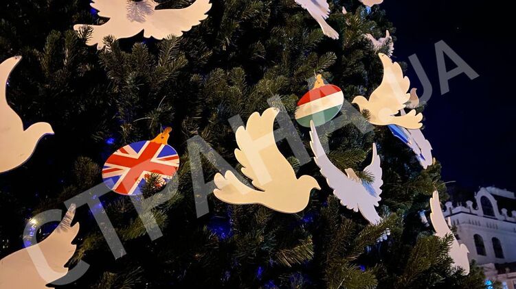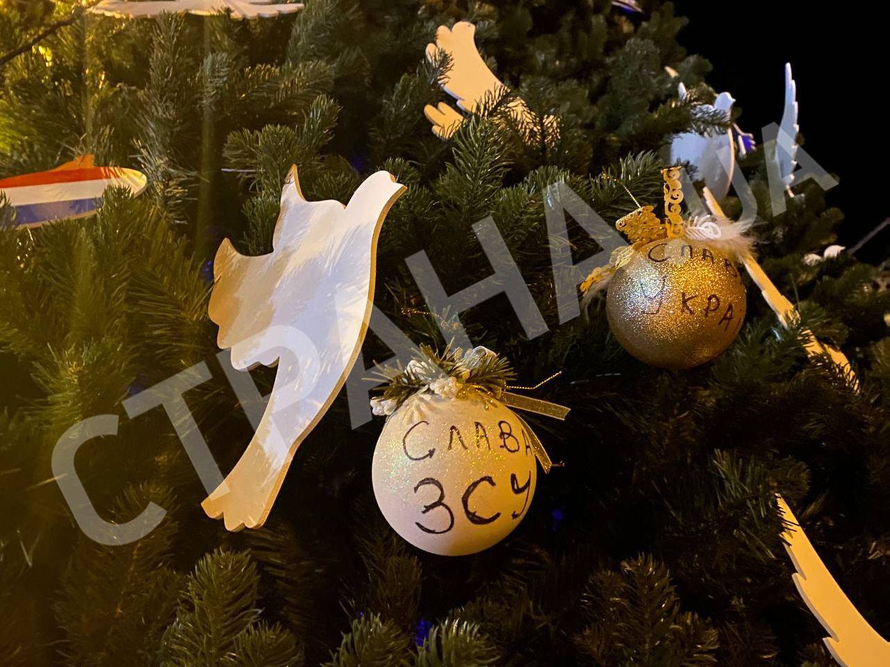 На новогоднем дереве развесили фигурки белых голубей и шары с флагами стран, которые помогают Украине в войне. Возле елке установлена фигура ангела-хранителя. Венчает дерево не традиционная звезда, а трезубец.