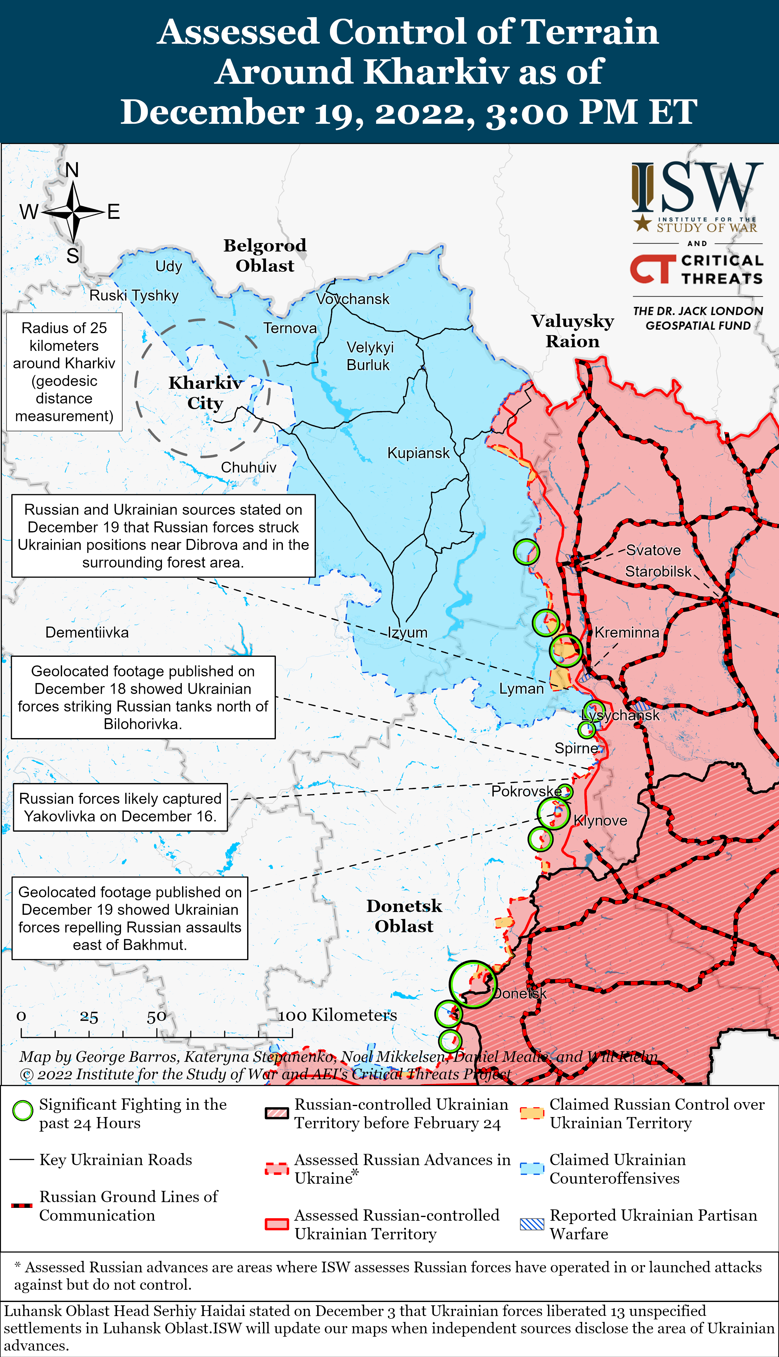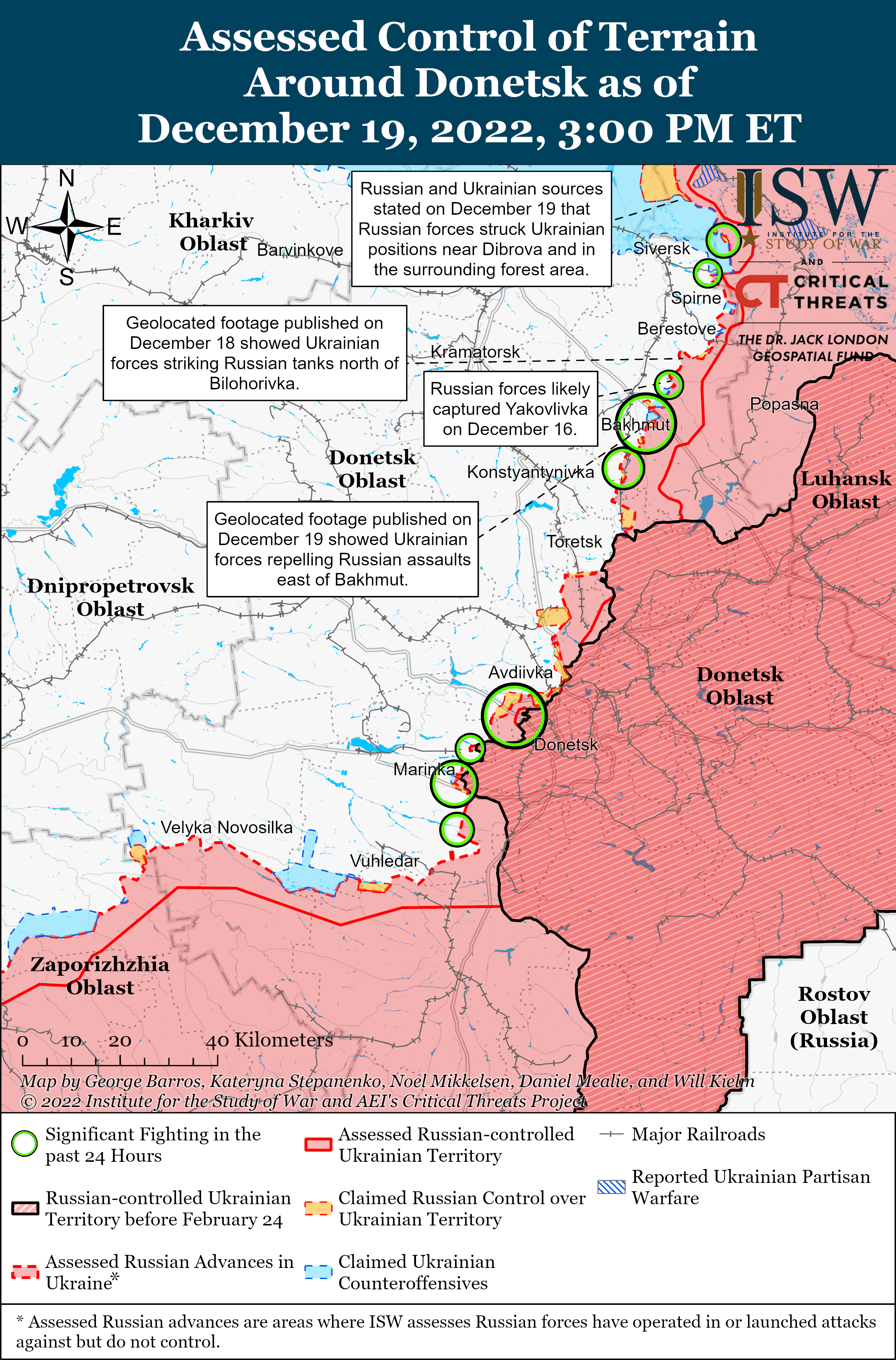 Сообщается также, что 18 декабря российские силы потеряли позиции к югу от Бахмута и продолжили наземные атаки в районе Бахмута и Донецка. Как пишет Институт, российский военный корреспондент, который, как сообщается, прикомандирован к подразделению, сражавшемуся к югу от Бахмута, 18 декабря признал, что украинским войскам удалось выбить российские войска из позиции, за которые они боролись "всю осень".