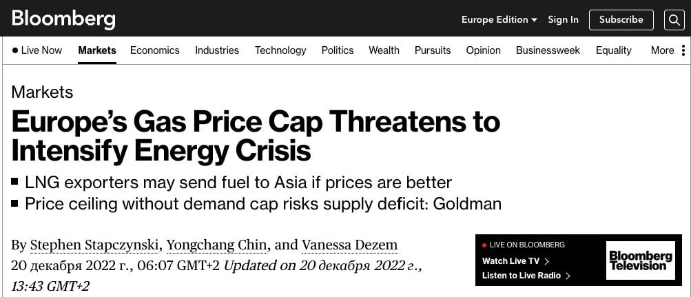 10:03 Введение потолка цен на газ, о котором на этой неделе договорились страны ЕС, может привести к ограничению поставок и усилению энергетического кризиса в регионе, пишет Bloomberg.