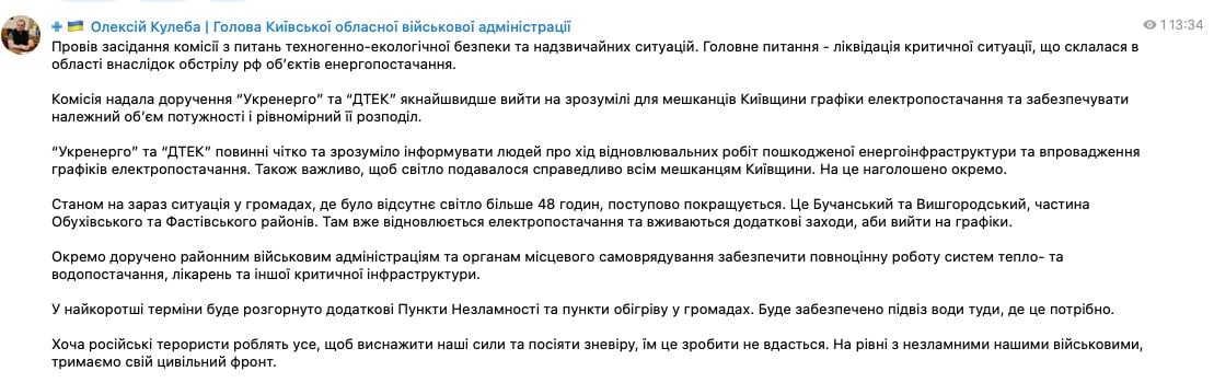 Как сообщалось, ситуация со светом в Киеве и всем центральном регионе остается тяжелой из-за повреждения магистральных сетей. Главной проблемой является не генерация, а доставка питания потребителям. Именно из-за разрушенных сетей и узлов большинство киевлян не могут получить свет в свои дома, заявлял Кулеба.